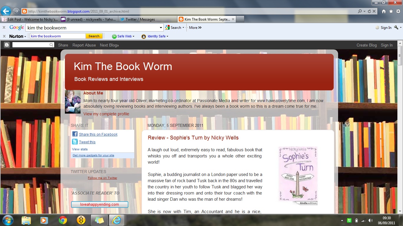 Another week rolls in, as weeks are wont to do, and the virtual book tour for Sophie’s Turn brings you more exciting events. First of all, there is a fabulous review for Sophie’s Turn from Kim Nash at Kim The Bookworm: http://kimthebookworm.blogspot.com/2011_09_01_archive.html.