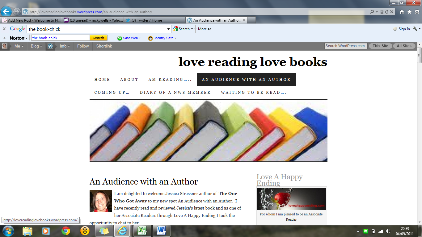 LAST WEEK saw three reviews and one interview! Find links all over this blog, but just to remind you… the reviews were by Lou Graham at www.lougrahamiiblog.wordpress.com/, Rea Sinfield at http://reabookreview.blogspot.com/, and Christy Goldstein at the Chick Lit Club at http://www.chicklitclub.com/. The interview by Laura Williams is live NOW at the Bookworm Ink. at http://www.bookwormink.co.uk/