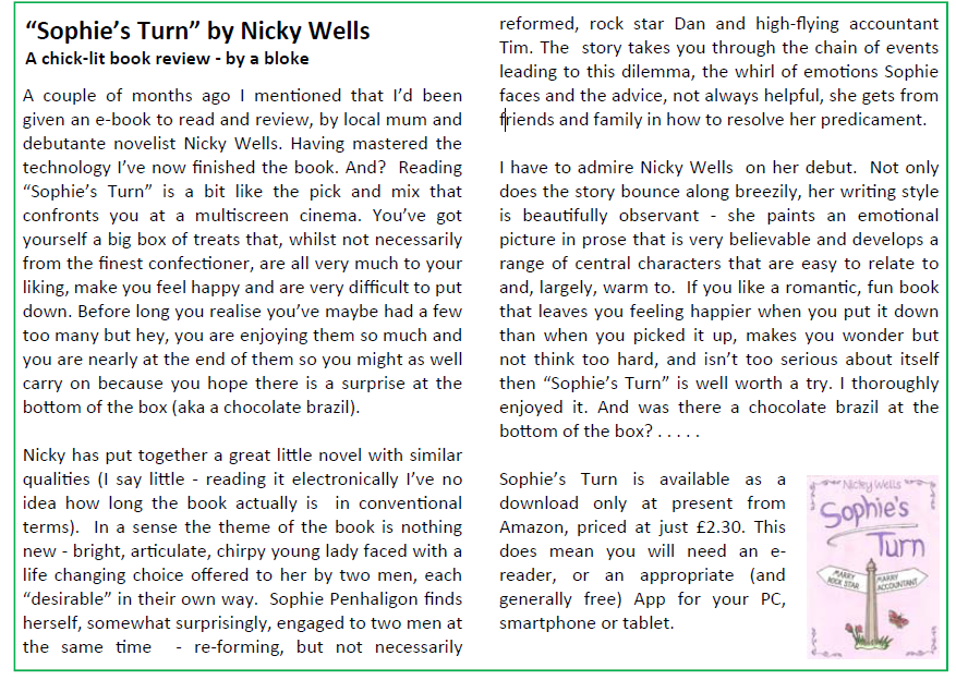 The editor of local magazine, The Bristol Nine, was intrigued by the idea of a local author self-publishing her first book.  He manfully tackled all manner of technological challenges (such as, not owning a Kindle at the time) to read my masterpiece.  Here’s what he thinks: