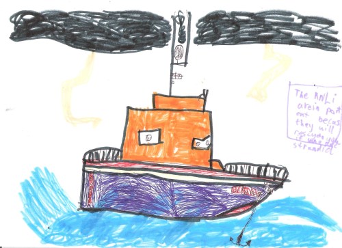 He has been a member of “Storm Force“, the RNLI club for young people, pretty much since he was born.  As a family, we love visiting lifeboat stations, watching exercises, or even (as has happened on a couple of occasions) real rescues.  To raise awareness for the RNLI and its lifeboats, my six-year old drew this picture this morning: